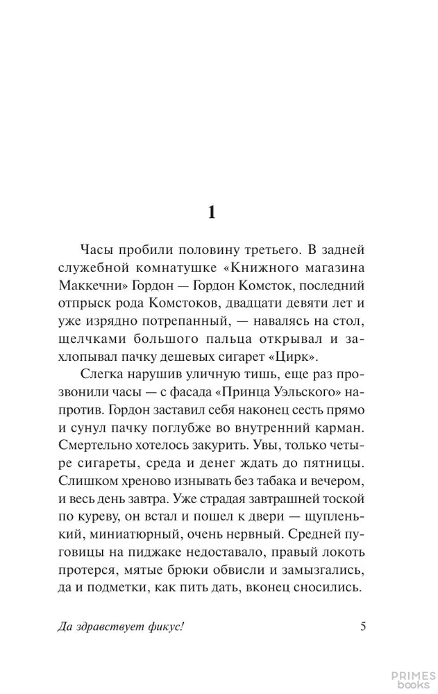 "Да здравствует фикус!" (1936) – горький, ироничный роман, во многом автобиографичный. Главный герой – Гордон Комсток, непризнанный поэт, писатель-неудачник, вынужденный служить в рекламном агентстве, чтобы заработать на жизнь. У него настоящий талант к сочинению слоганов, но его работа внушает ему отвращение, представляется карикатурой на литературное творчество.